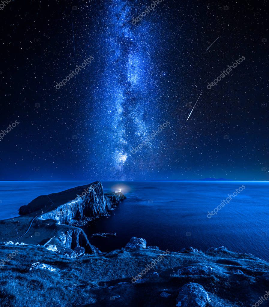 Neist point lighthouse and falling stars, Isle of Skye, Scotland