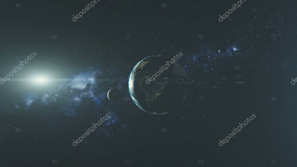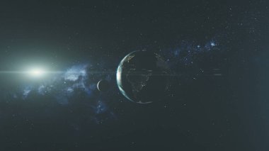 Planet Earth Spin Moon Orbit Space Sun Beam Glow. Star Open Galaxy Constellation Satellite View Radiance Milky Way Light Space Travel Concept 3D Animation