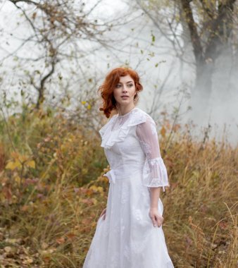 Beautiful young lady with red hair in gorgeous vintage white dress in the forest in the fog. Late autumn cold. Melancholy