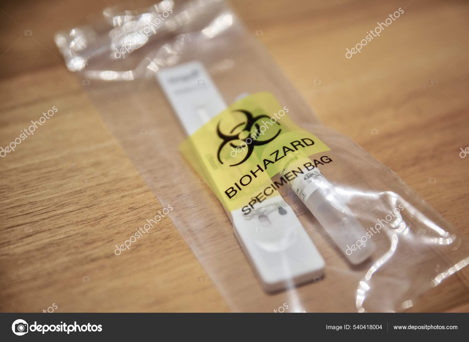 - Крупный план использованного комплекта коронных тестов в пластиковом пакете.