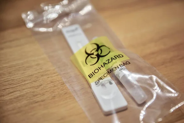 Крупный план использованного комплекта коронных тестов в пластиковом пакете. — фото