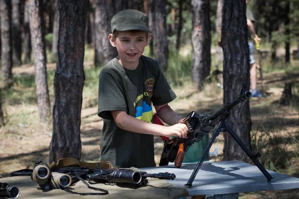 Діти грають зі зброєю в військово патріотичного тренувальному таборі в Київська область, Україна. — стокове фото